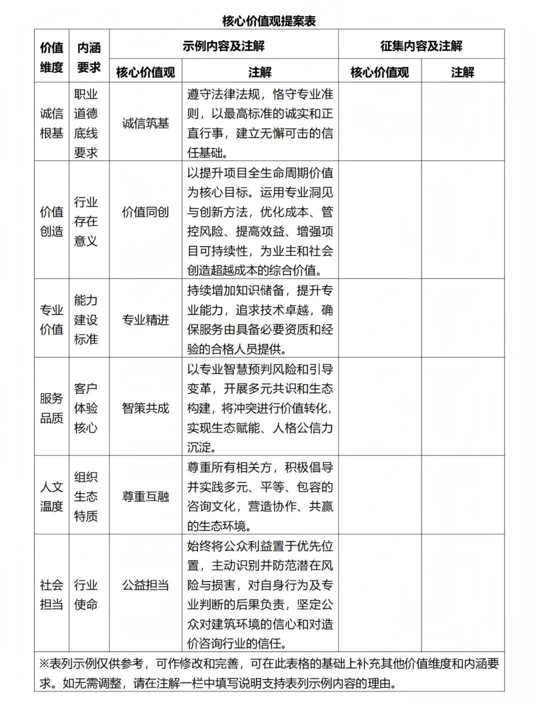 (A)必选:《工程造价核心价值观提案表》(详见附件);