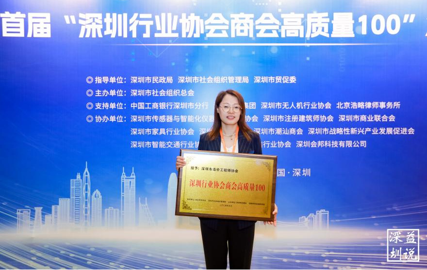 5月22日,由深圳市民政局、深圳市社会组织管理局、深圳市贸促委指导、深圳市社会组织总会主办的首届“深圳行业协会商会高质量100”发布会成功举办。发布会邀请了原深圳市副市长陈彪、深圳市民政局党组成员兼深圳市社会组织管理局局长李文海、深圳特区报编委金文蓉等嘉宾出席。现场举行了首届“深圳行业协会商会高质量100”授牌仪式、深圳社会组织助力乡村振兴实践班结业授牌仪式、行业协会商会高质量100对话交流等内容。来自行业协会的相关负责人、企业代表等200余人参与大会,深圳市造价工程师协会会长吴慧博、秘书长张燕燕应邀参加。